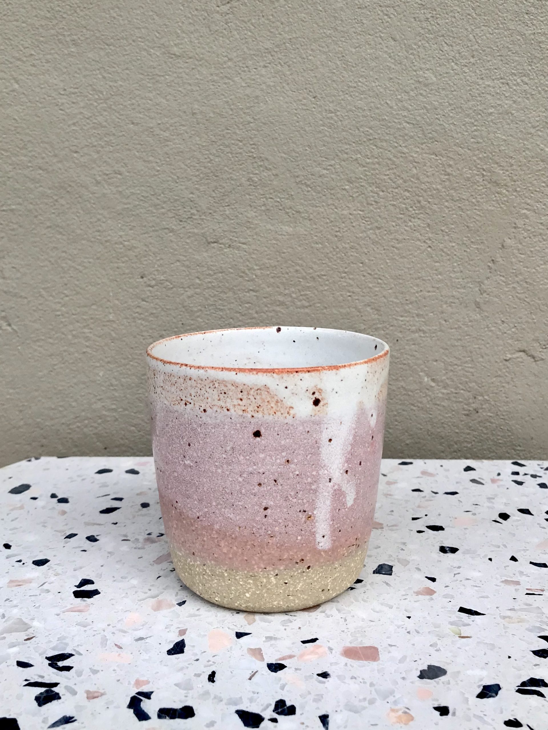 A wheel thrown 8oz cup in a slightly speckled stoneware clay glazed in non toxic glazes.